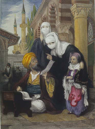 كاتب المطالب، القسطنطينية، نقيشة لـ توماس ألوم 1840 Letter writer, Constantinople, engraving 1840 by Thomas Allom
